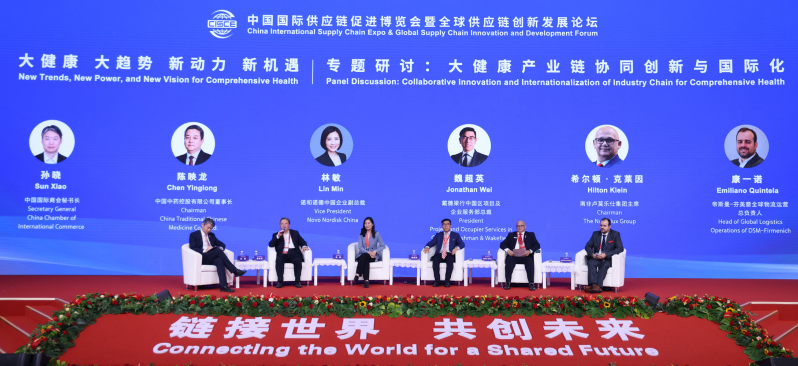 中國(guó)中藥控股有限公司董事長(zhǎng)陳映龍、諾和諾德中國(guó)企業(yè)副總裁林敏、戴德梁行中國(guó)區(qū)項(xiàng)目及企業(yè)服務(wù)部總裁魏超英、南非盧莫樂(lè)仕集團(tuán)主席希爾頓·克萊因、帝斯曼-芬美意全球物流運(yùn)營(yíng)總負(fù)責(zé)人康一諾等5位嘉賓分別就“大健康產(chǎn)業(yè)鏈協(xié)同創(chuàng)新與國(guó)際化”主題展開(kāi)討論。專(zhuān)題研討環(huán)節(jié)由中國(guó)國(guó)際商會(huì)秘書(shū)長(zhǎng)孫曉主持。