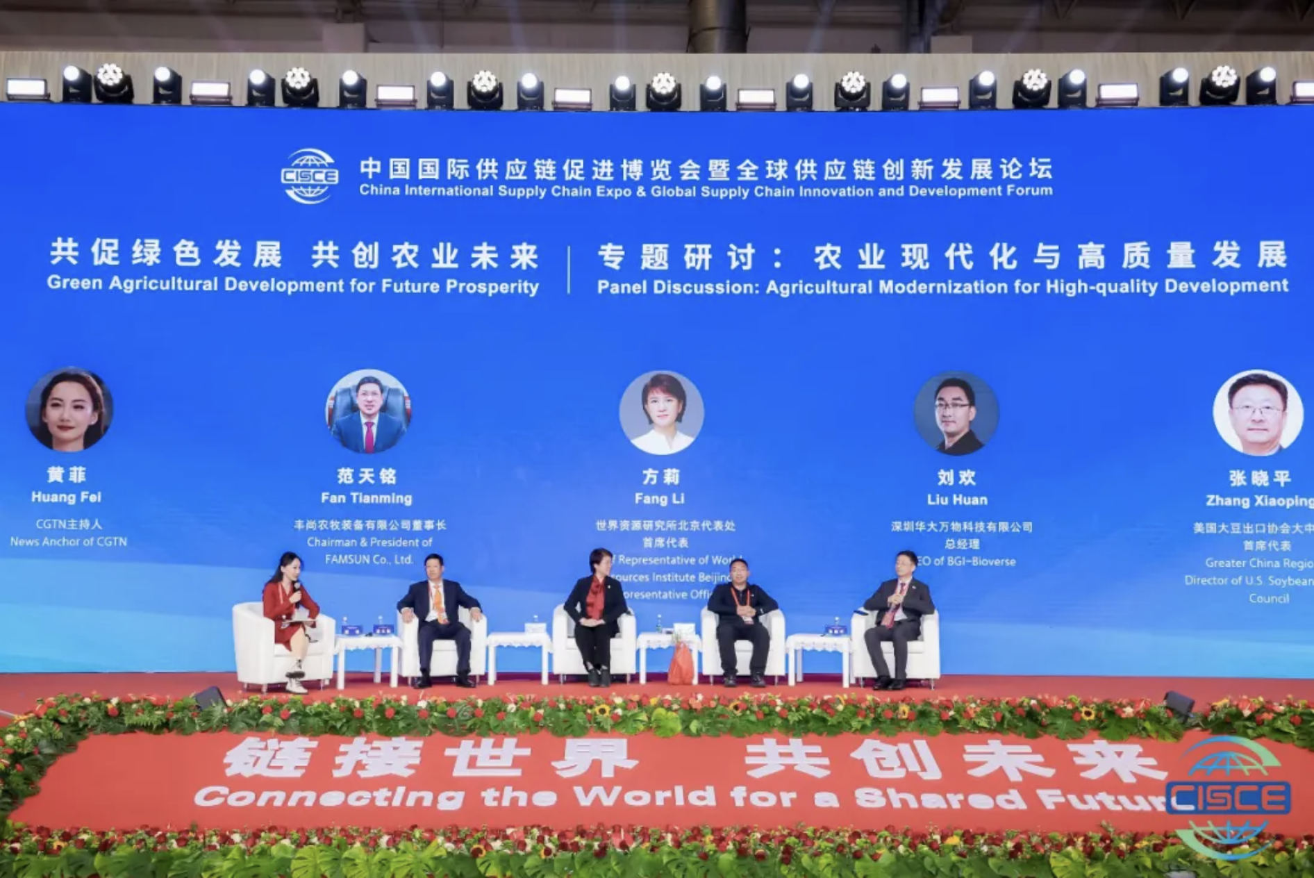 中國農(nóng)業(yè)機(jī)械化科學(xué)研究院集團(tuán)公司總經(jīng)理苑嚴(yán)偉、漢堡王(中國)投資有限公司首席執(zhí)行官博濤、五糧液股份公司副總經(jīng)理李健、麥當(dāng)勞中國供應(yīng)鏈可持續(xù)發(fā)展副總裁張雁兒、北京盒馬網(wǎng)絡(luò)科技有限公司副總經(jīng)理張欣宇、豐尚農(nóng)牧裝備有限公司董事長范天銘、世界資源研究所北京代表處首席代表方莉、深圳華大萬物科技有限公司總經(jīng)理劉歡、美國大豆出口協(xié)會(huì)大中華區(qū)首席代表張曉平9位嘉賓分別就“聚焦綠色可持續(xù)發(fā)展,促進(jìn)農(nóng)業(yè)供應(yīng)鏈暢通”“農(nóng)業(yè)現(xiàn)代化與高質(zhì)量發(fā)展”兩個(gè)主題展開討論。專題研討環(huán)節(jié)由中國國際電視臺(tái)黃菲主持。