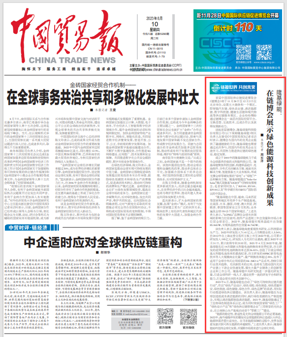 談起首屆鏈博會,隆基綠能科技股份有限公司(以下簡稱隆基綠能)相關(guān)負責(zé)人在接受《中國貿(mào)易報》記者采訪時表示,鏈博會為國內(nèi)外的優(yōu)秀企業(yè)提供了融通鏈接的平臺,隆基綠能也期望通過此次參與,同國內(nèi)外的優(yōu)秀企業(yè)交流學(xué)習(xí),共同努力推進供應(yīng)鏈的綠色建設(shè)、穩(wěn)定發(fā)展。