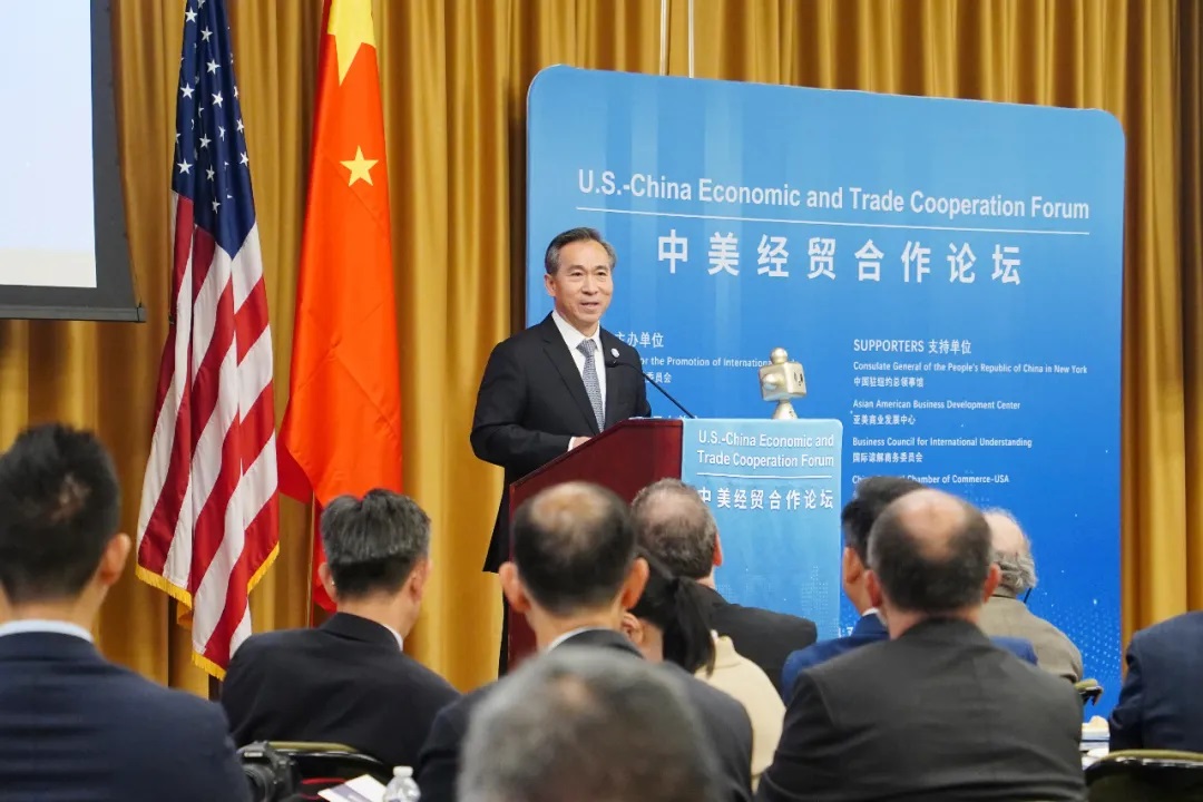 當?shù)貢r間7月29日,在中國貿促會會長任鴻斌率中國企業(yè)家代表團訪問美國期間,中國—美國經(jīng)貿合作論壇在紐約舉行。中國貿促會會長任鴻斌,中國駐紐約總領事館總領事黃屏,國際諒解商務委員會總裁兼首席執(zhí)行官彼得·提察恩斯基,亞美商業(yè)發(fā)展中心總裁王章華,美國國際工商理事會首席執(zhí)行官戴克蘭·達利,美國中國總商會會長、中國銀行美國地區(qū)行長胡威等出席并致辭,300余位中美企業(yè)及商協(xié)會代表出席。