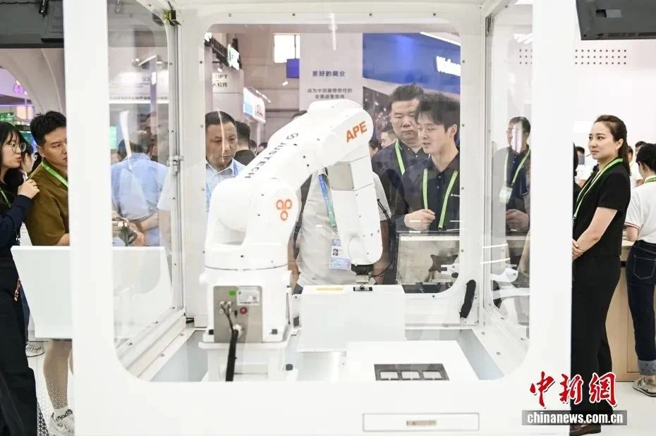 圖為觀眾在蘋果供應(yīng)鏈展臺(tái)了解機(jī)械臂。中新網(wǎng)記者 李駿 攝