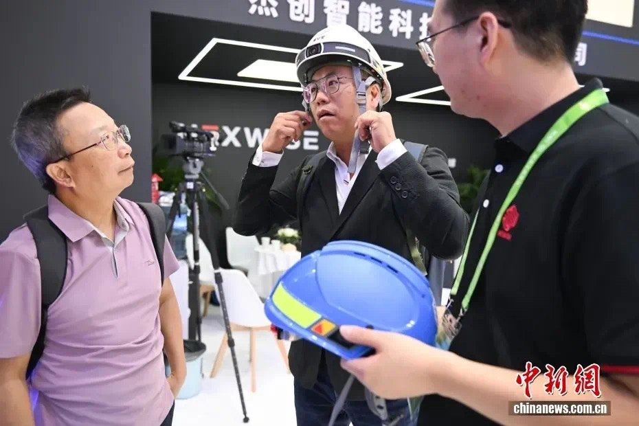 圖為觀眾體驗(yàn)智能安全帽。中新網(wǎng)記者 李駿 攝