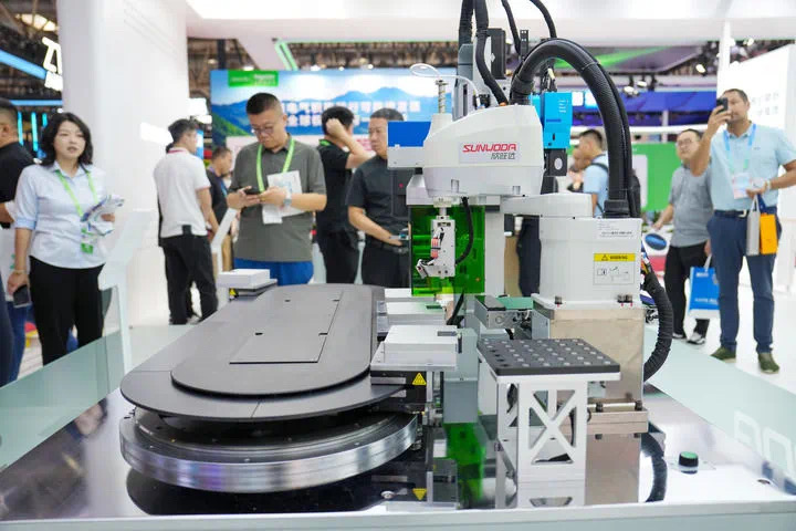 7月17日,在數(shù)字科技鏈展區(qū),參觀者在蘋果電池供應(yīng)商欣旺達展臺參觀磁懸浮輸送產(chǎn)線展示。新華社發(fā)