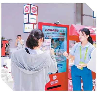 觀眾在鏈博會必勝客活動現(xiàn)場體驗紀(jì)念報紙打印設(shè)備。白 笙攝