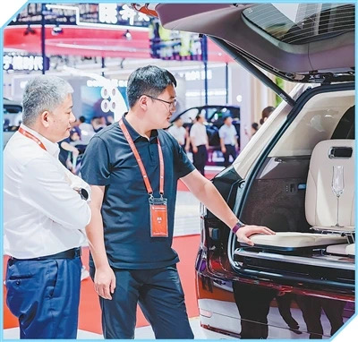 觀眾在鏈博會上體驗問界M9汽車推出的新型座椅“山海坐席”。鄧?yán)钜鏀z